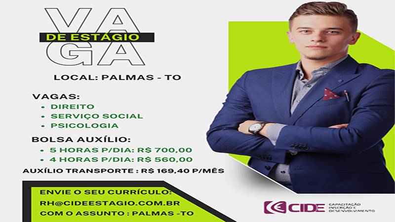 Os interessados deverão enviar o currículo atualizado para o e-mail rh@cideestagio.com.br com o assunto "PALMAS - TO" e, em seguida, realizar o cadastro de estudante no site do Agente de Integração CIDE RH: https://ciderh.org.br/