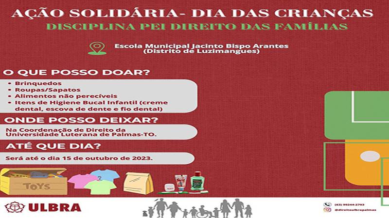 Os estudantes do 6º período do curso de Direito da Ulbra Palmas, em colaboração com a Professora Mestra Fabiana Luiza e a Clínica de Direitos Humanos da ULBRA Palmas, organizaram uma ação solidária em comemoração ao Dia das Crianças. Estão sendo coletadas doações de brinquedos, roupas, sapatos e alimentos não perecíveis.