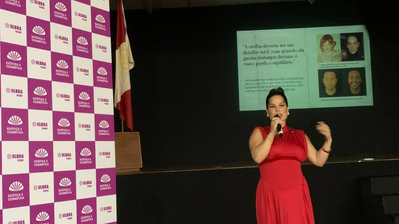 Durante a palestra, a convidada destacou diferentes abordagens dentro da harmonização facial e chamou atenção para procedimentos ainda pouco discutidos no meio acadêmico, como a otomodelação, técnica voltada à correção estética da região das orelhas sem necessidade de intervenção cirúrgica.