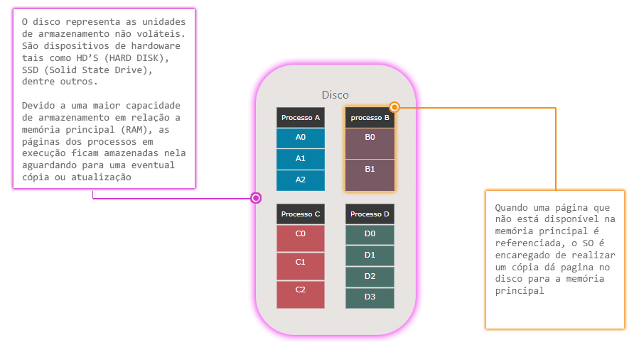 As demais páginas, assim como todas as páginas do processo (inclusive as páginas na RAM), ficam armazenadas no disco.